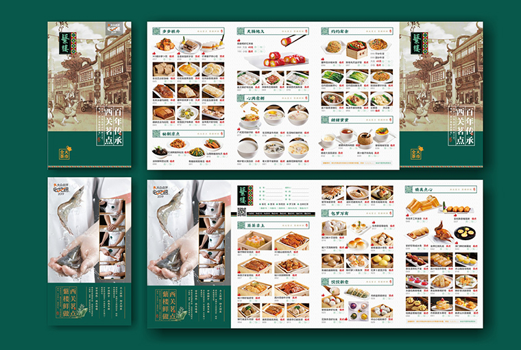 不同的點心茶樓,品牌特性不同,產(chǎn)品數(shù)量也不同,定位人群也略有差異,版式編排及文案風格都會有所不同。