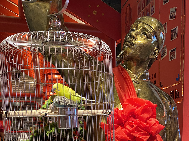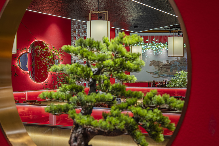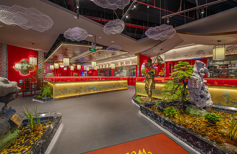 京味張的空間裝飾設(shè)計大量借鑒了中式園林造景手法,一步一小景、三步一大景,步移景異。用中國紅強化品牌內(nèi)含的北京皇城文化,令人印象鮮明;門口的迎賓人,提籠遛鳥人,跑堂人等雕塑銅人將老北京烤鴨飲食文化自然帶出;中式園林造景手法,點綴綠植,水景,框景,步移景異;天花的不銹鋼波紋板,一朵朵的祥云裝飾;矮隔斷的千里江山中國山水工筆畫造型裝飾,仿佛流動的山水國畫;立面的水晶玻璃磚,暗藏?zé)魩У牟AЦ魯啵臻g中各種不銹鋼收邊條,明檔上的不銹鋼背發(fā)光字,現(xiàn)代裝飾材料與經(jīng)典美食交相輝映,經(jīng)典不失時尚。