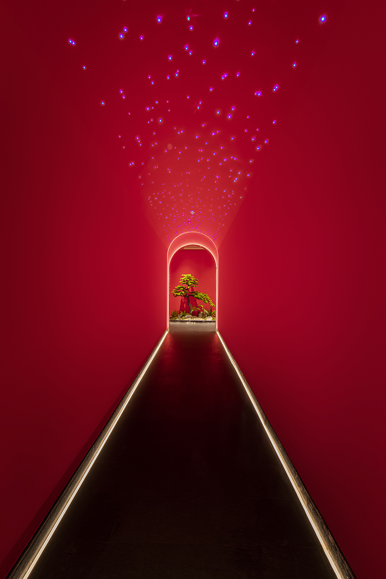 部分立面使用玻璃磚作為隔斷,在燈帶烘托下,產(chǎn)生一種晶瑩剔透感,時尚又夢幻;大廳卡座的隔斷高110CM,圓洞虛實結(jié)合,畫在景后,景在畫中。