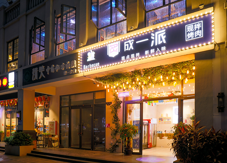 炙成一派是海口一家以現拌現烤為特色的炙子烤肉店。品深餐飲全案策劃設計認為空間裝飾裝修設計是品牌形象整體落地的核心環節。