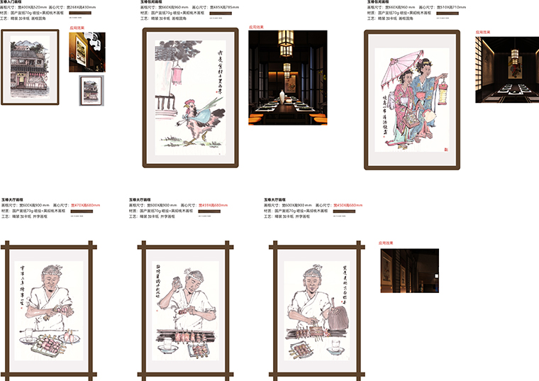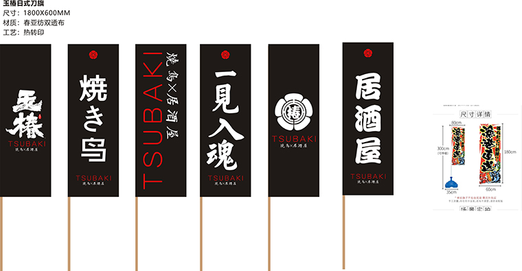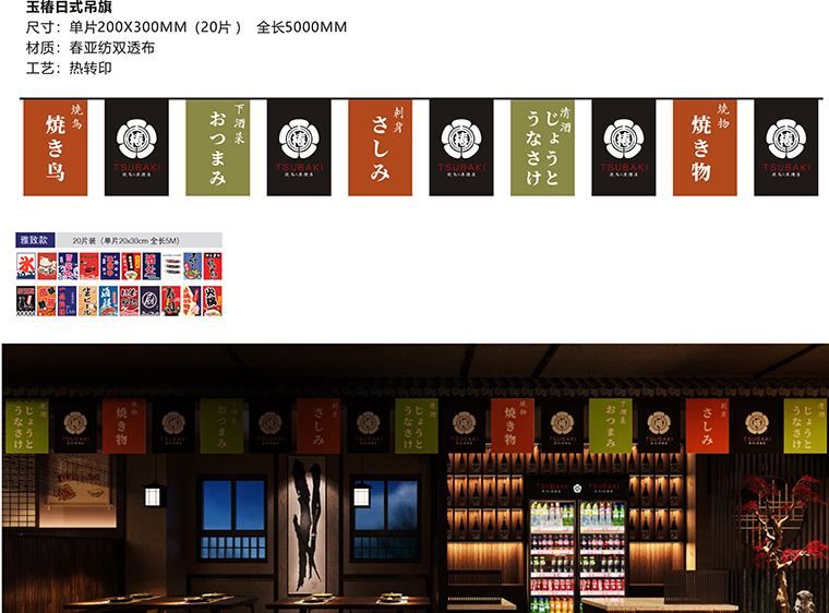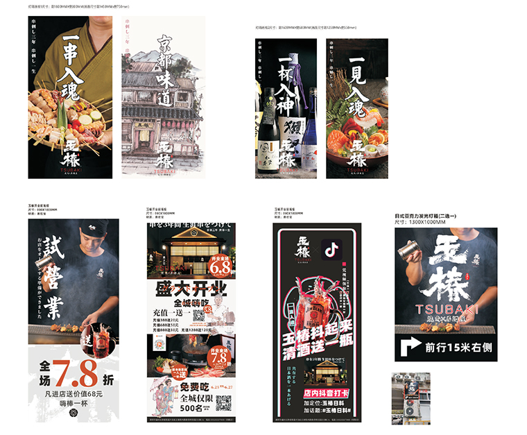 品牌記憶點:日本京都風(fēng)格門頭設(shè)計+玉椿標(biāo)識及家徽+燒鳥手繪畫面+四大主色調(diào)。