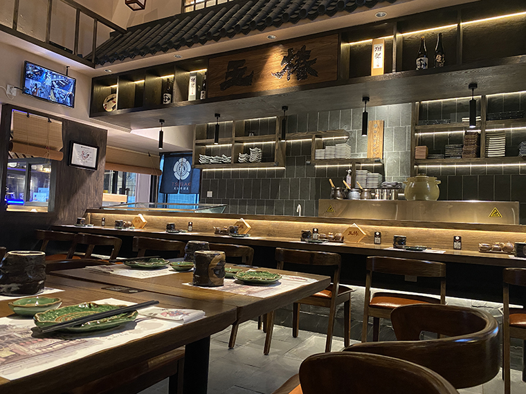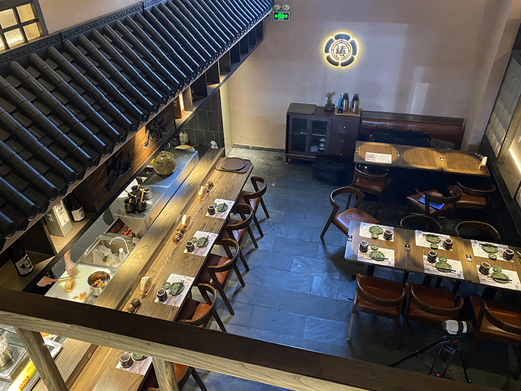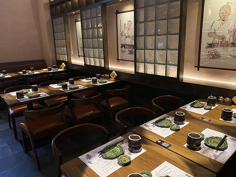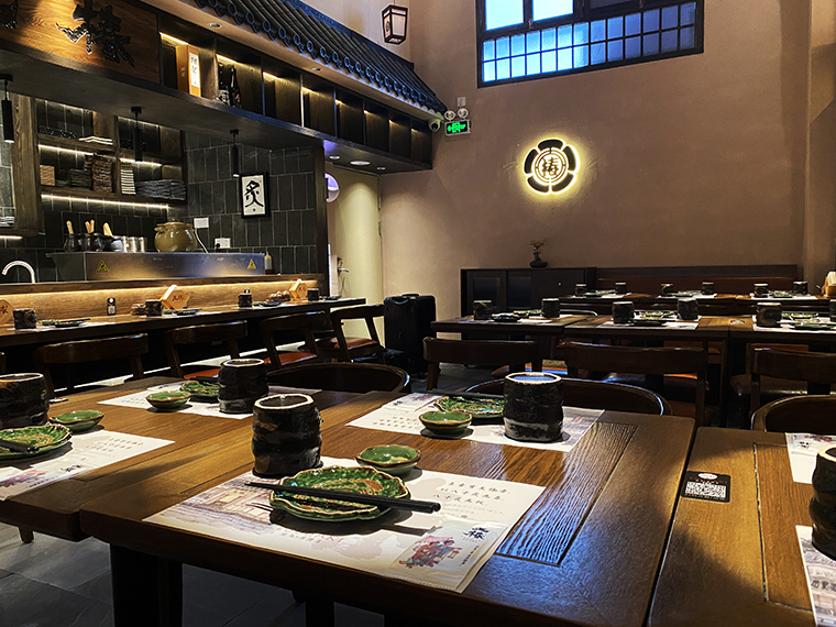 相對于其他日本料理,溫暖治愈有煙火氣的居酒屋是打開心門的神奇鑰匙。在這里,可以褪下面具,卸下防備,輕松肆意地喝酒聊天,大聲談笑,沒有職場的煩惱,沒有生活的瑣碎,有的是伴隨冰涼的鮮啤入喉部之后的片刻歡愉,有的只是一個釋放自我的放空間。居酒屋的熱鬧感,燒鳥店的煙火氣,京都老店的歷史文化魅力,是品深設(shè)計團(tuán)隊重點突破的設(shè)計表達(dá)。