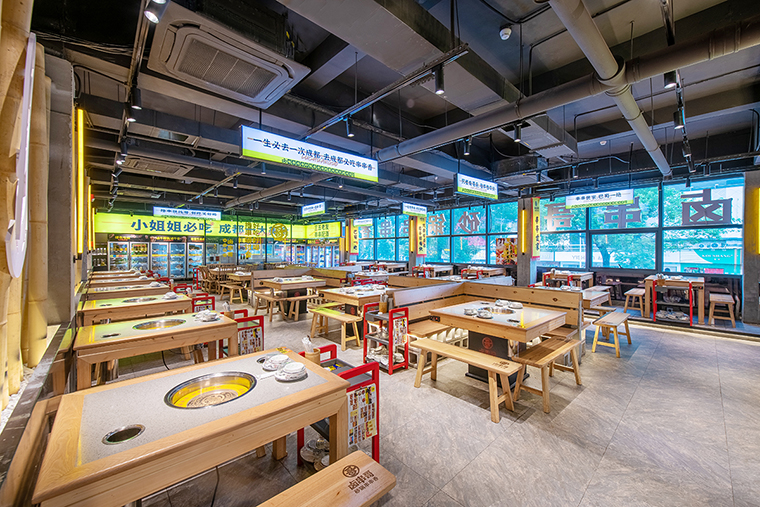 3、為了表現(xiàn)成都串串香火鍋店的市井氣息,我們?nèi)サ袅说蹴敚瑴p少立面造型,墻體使用了水泥面,還原出老成都串串香火鍋店的場(chǎng)景氣質(zhì),家具使用木質(zhì)卡座與條凳八仙桌,竹椅,此次門店還創(chuàng)造性地沒有使用吊燈,僅使用軌道射燈,整個(gè)空間硬裝修造價(jià)不到800元每平方米,是后疫情時(shí)期餐飲門店裝修投資最好方向。