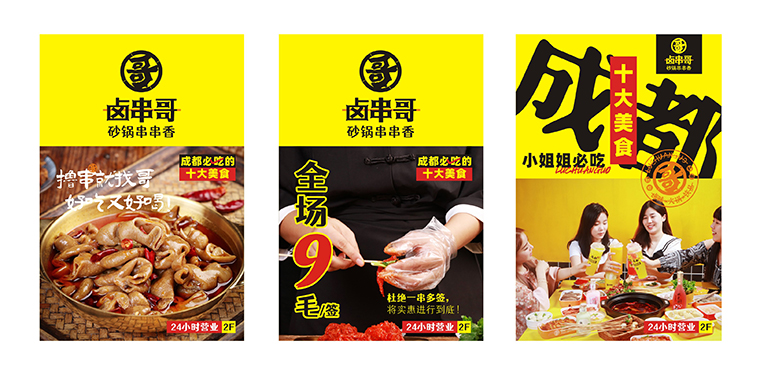 1、將門頭設(shè)計(jì)轉(zhuǎn)變成門面設(shè)計(jì),重點(diǎn)投入,反復(fù)推敲,裝修經(jīng)費(fèi)傾斜,用力猛一些。鹵串哥坪山店的整個(gè)外立面廣告招牌,設(shè)計(jì)非常大氣,覆蓋一整面墻,讓遠(yuǎn)遠(yuǎn)的顧客都能看見,門面上顧客可看見的地方不斷重復(fù)強(qiáng)調(diào)品牌核心訴求,如24小時(shí)營(yíng)業(yè),地道成都砂鍋串串香,小姐姐必吃成都十大美食,9毛一簽等,讓門面成立吸引消費(fèi)者進(jìn)店的大利器。