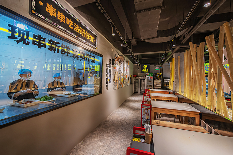 在空間中,我們用鹵串哥品牌強(qiáng)關(guān)聯(lián)的具體一個(gè)竹元素串聯(lián)整個(gè)裝飾,形成品牌專屬識(shí)別記憶,并與串串香的竹簽子,竹椅相呼應(yīng),既有品類特征,又是品牌文化的經(jīng)典傳達(dá)。