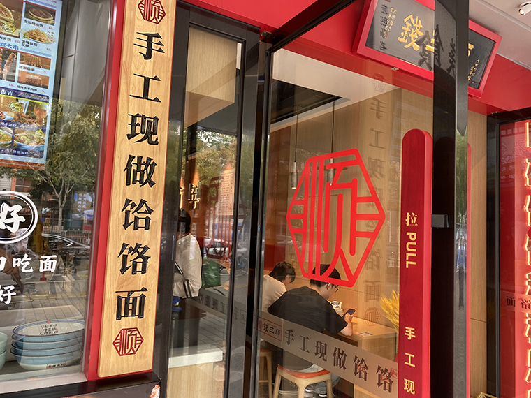 1、從門頭設(shè)計(jì)到門面設(shè)計(jì)表達(dá),整個(gè)門店設(shè)計(jì)的重心:手工現(xiàn)做饸饹面,這是我們產(chǎn)品的靈魂,也是我們區(qū)別于其他連鎖面館產(chǎn)品的核心。康熙賜名,是品牌故事的傳說,也是饸饹面權(quán)威背書的一種方式。與門口張貼的非物質(zhì)文化遺傳美食相呼應(yīng),讓消費(fèi)者對(duì)饸饹面有了認(rèn)知,對(duì)錢三順品牌肅然起敬;