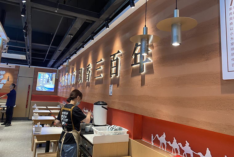 1、整個(gè)空間圍繞饸饹面是西北的小吃,在墻面的裝飾材料上用了能代表西北地貌特色的黃土高原涂料,顏色暖黃極像黃土。進(jìn)入門店,仿佛置身于大西北的某個(gè)面館,讓顧客產(chǎn)生了品牌的認(rèn)同。